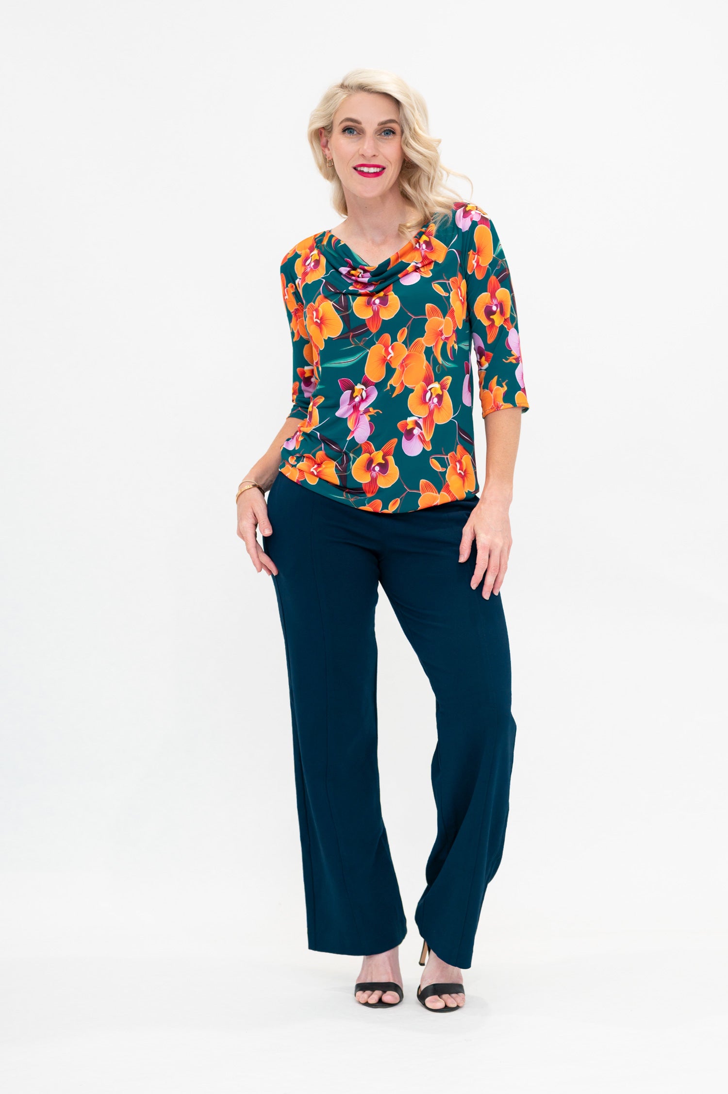 She is ready to create an impression that lasts. Orchids in orange, fuscia and pink on a deep teal base are perfect transitional hues for now + later.