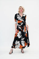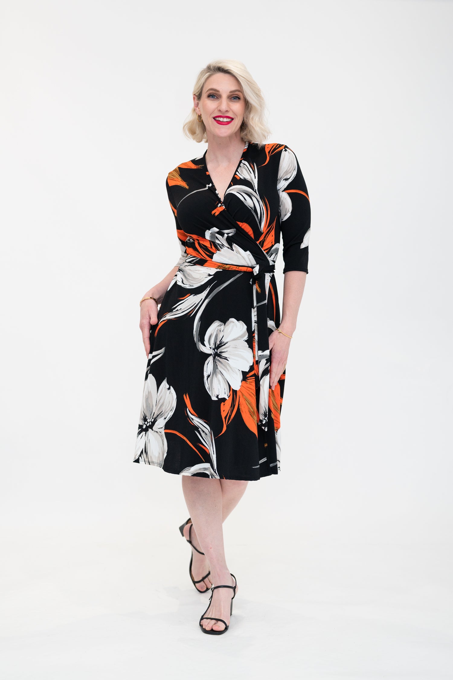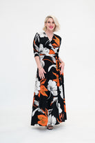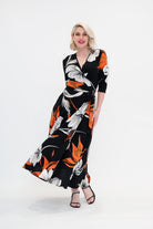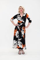 Ophelia is sophisticated with a spark. A classy black base meets ivory blooms and a whisper of orange for contrast - elegant and full of life. Made from our signature stretch jersey, this wrap dress feels effortless to wear.