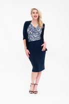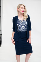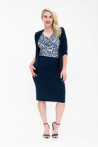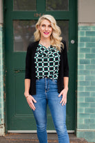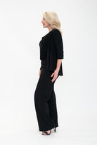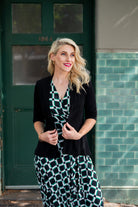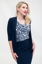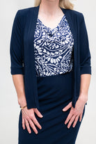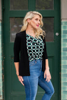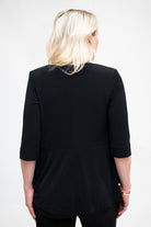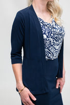 Shrug - Soft Jacket with 3/4 Sleeve and Peplum Hem in Black And Navy. Great for cooler weather, travelling, or a cold office