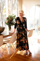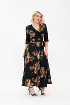 The Amber Wrap Dress features a black jacquard base kissed with luminous coppery-gold foil florals. Designed to catch the light just right – for dining by candlelight and dancing under fairy lights. Flattering across all shapes, the signature wrap fit creates definition while gliding comfortably over curves. A timeless floral with a little extra thrill.