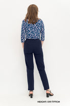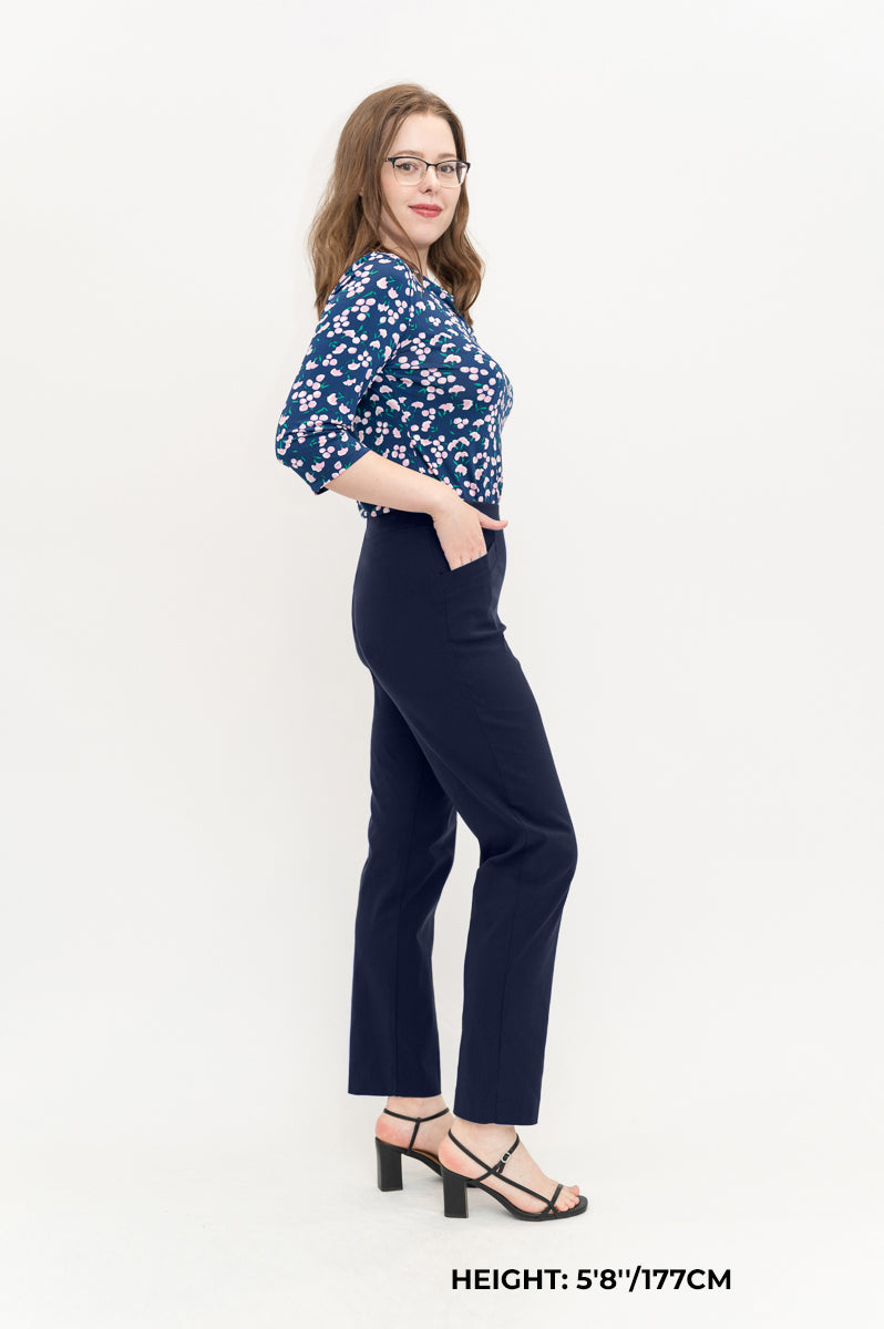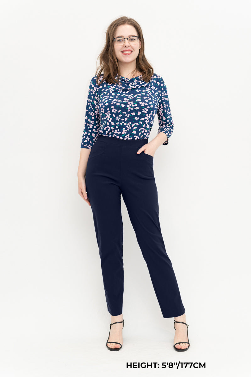 She's a narrow slim cut full-length leg with a flat elastic waistband. This gorgeous everyday pull-on style has pockets fitted at the hip and small ankle side seam vents for ease of wear.