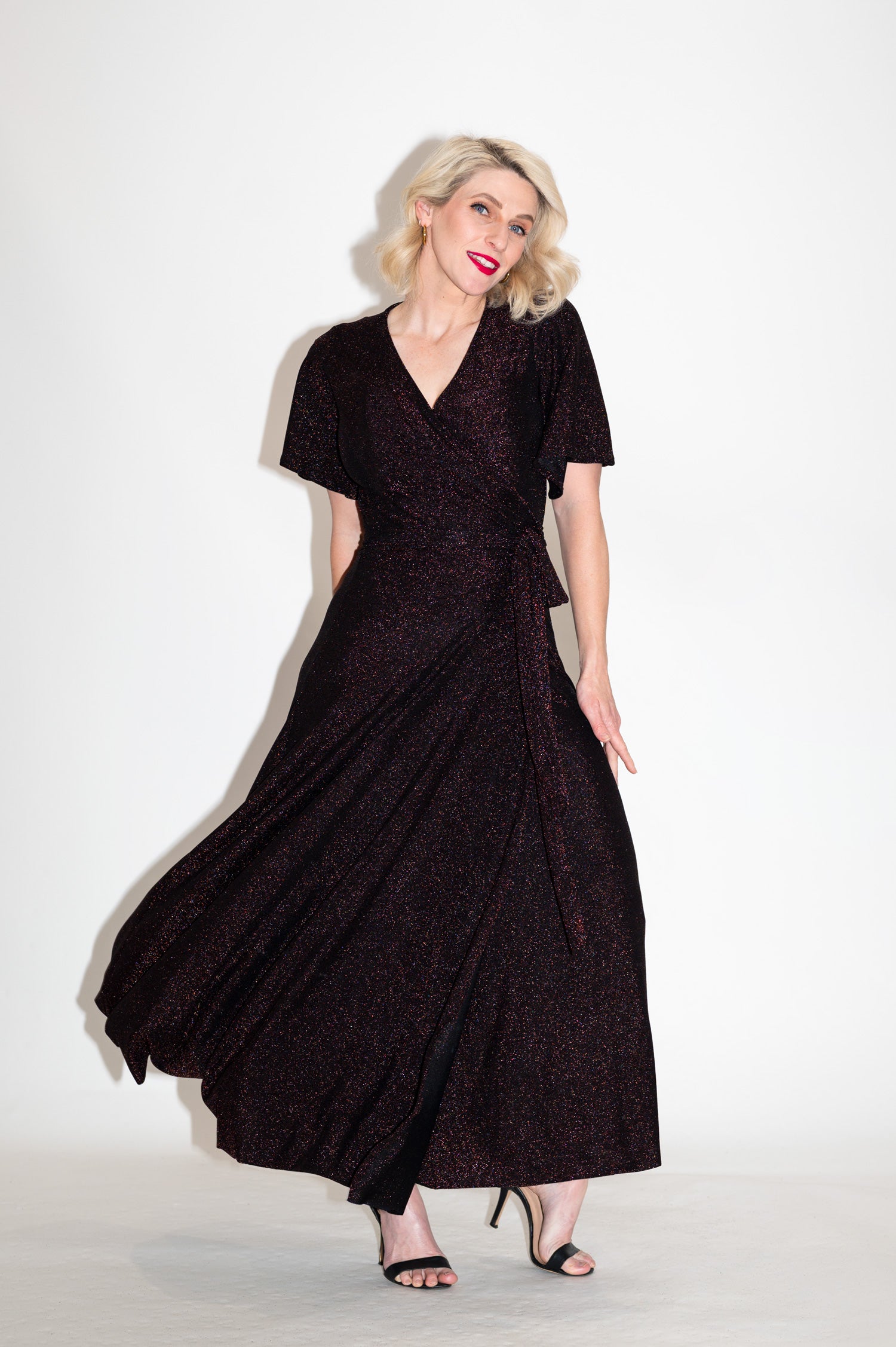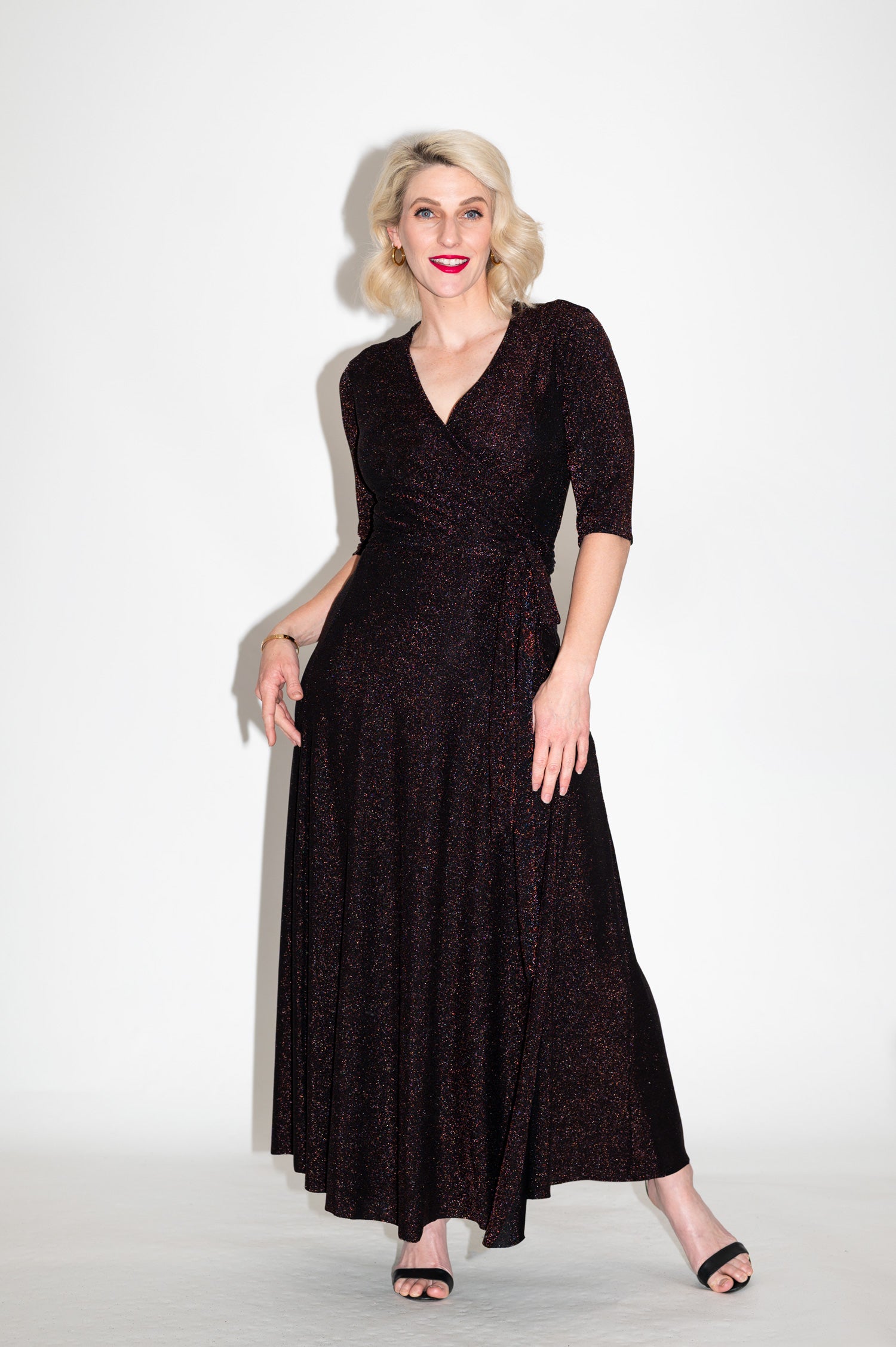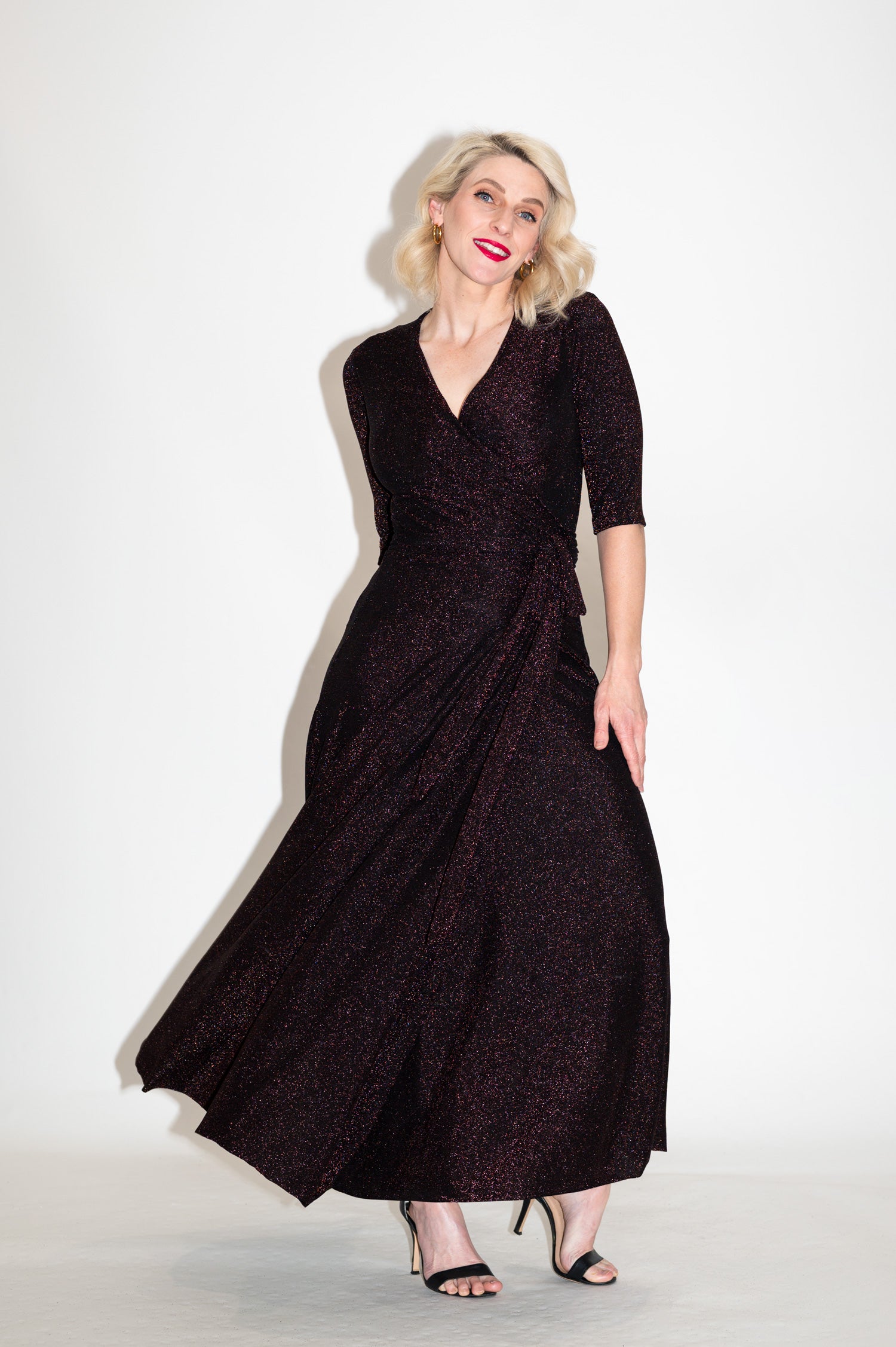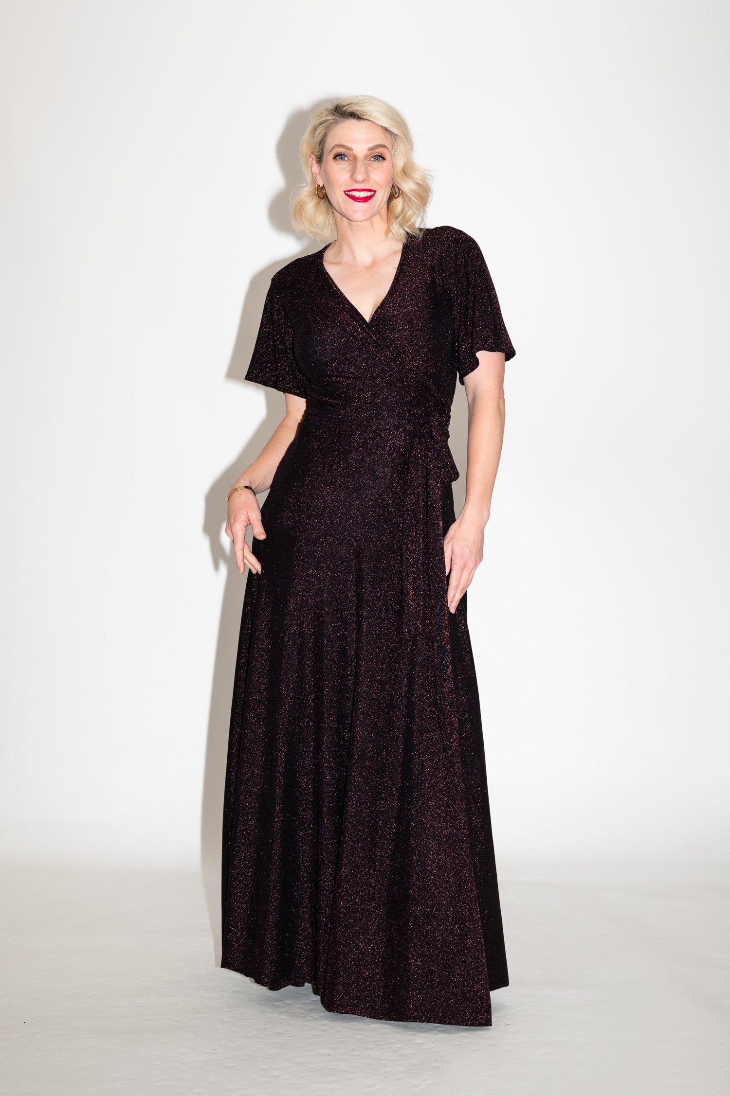 For the bright sparkle lovers. The Bonnie Wrap Dress in cocoa brown offers a warm, elegant twist on traditional evening wear. Its rich hue glows softly in the light while the shimmer-touch fabric adds luxe texture. A quietly powerful party dress that feels just as beautiful as it looks.