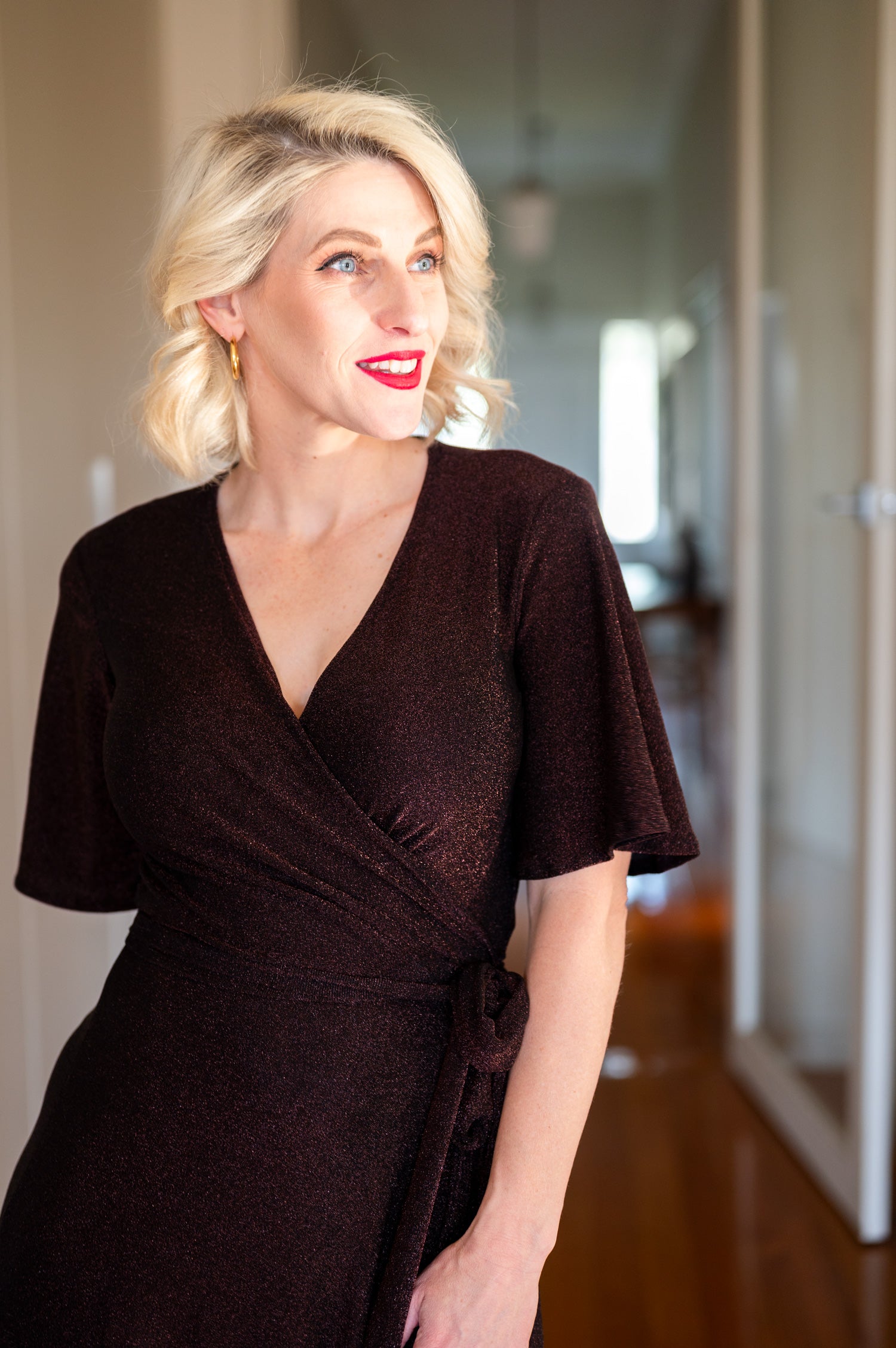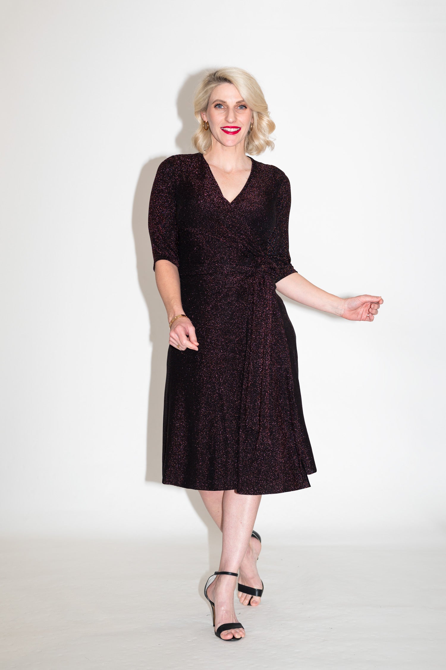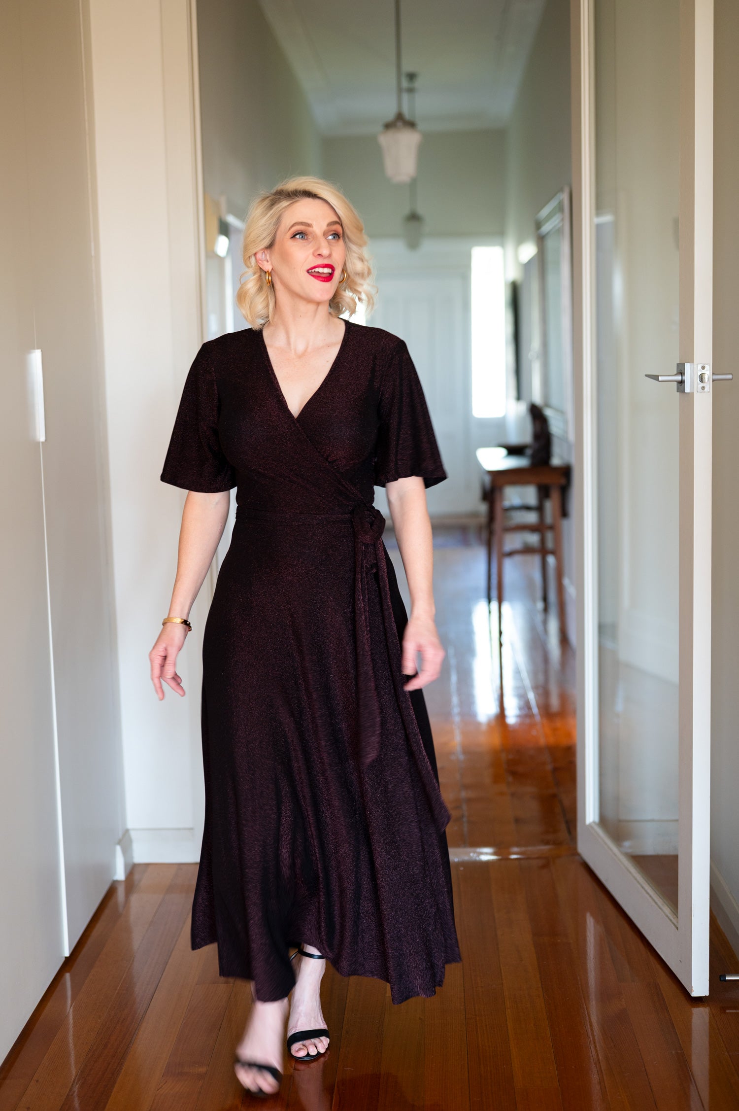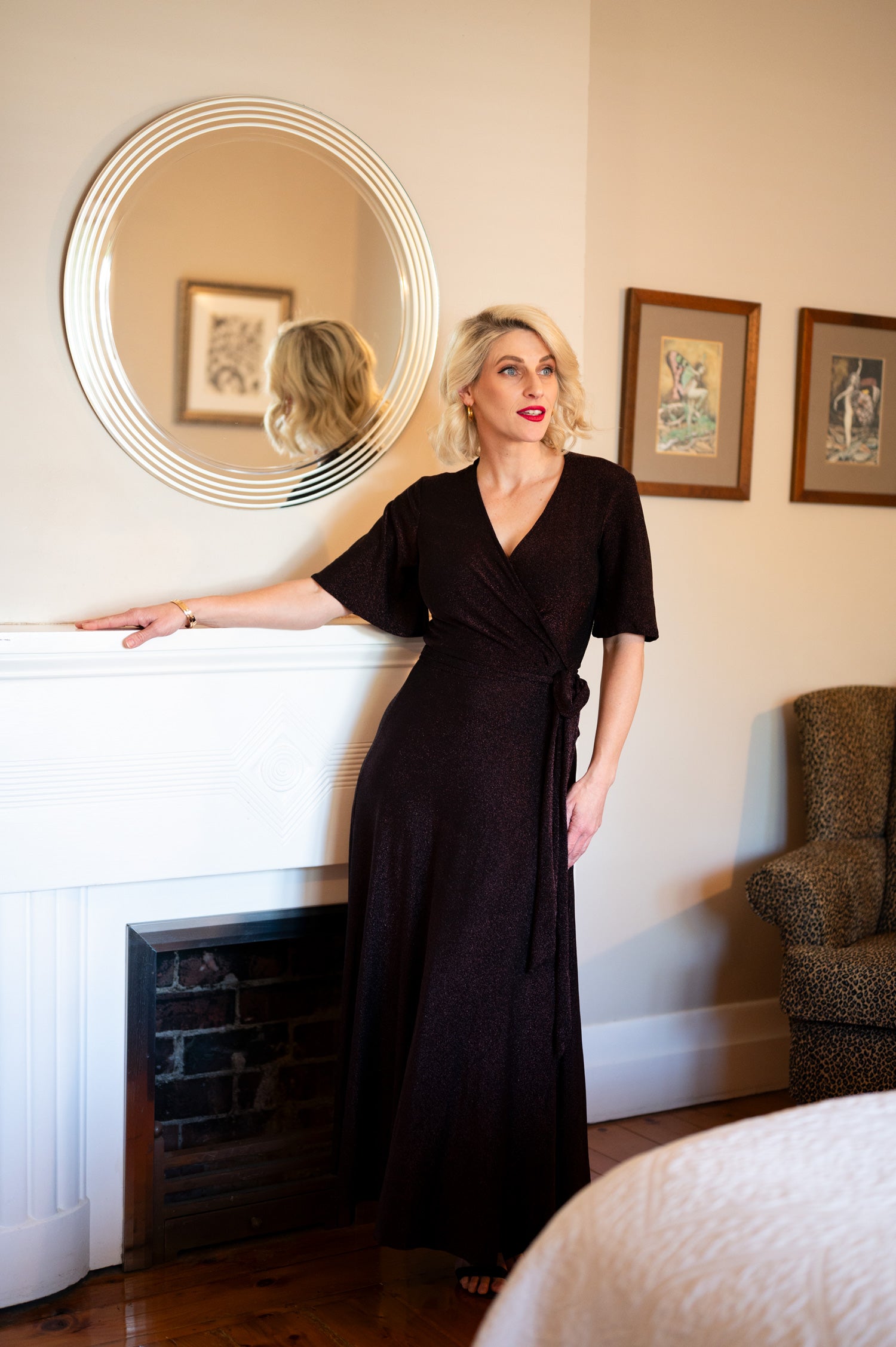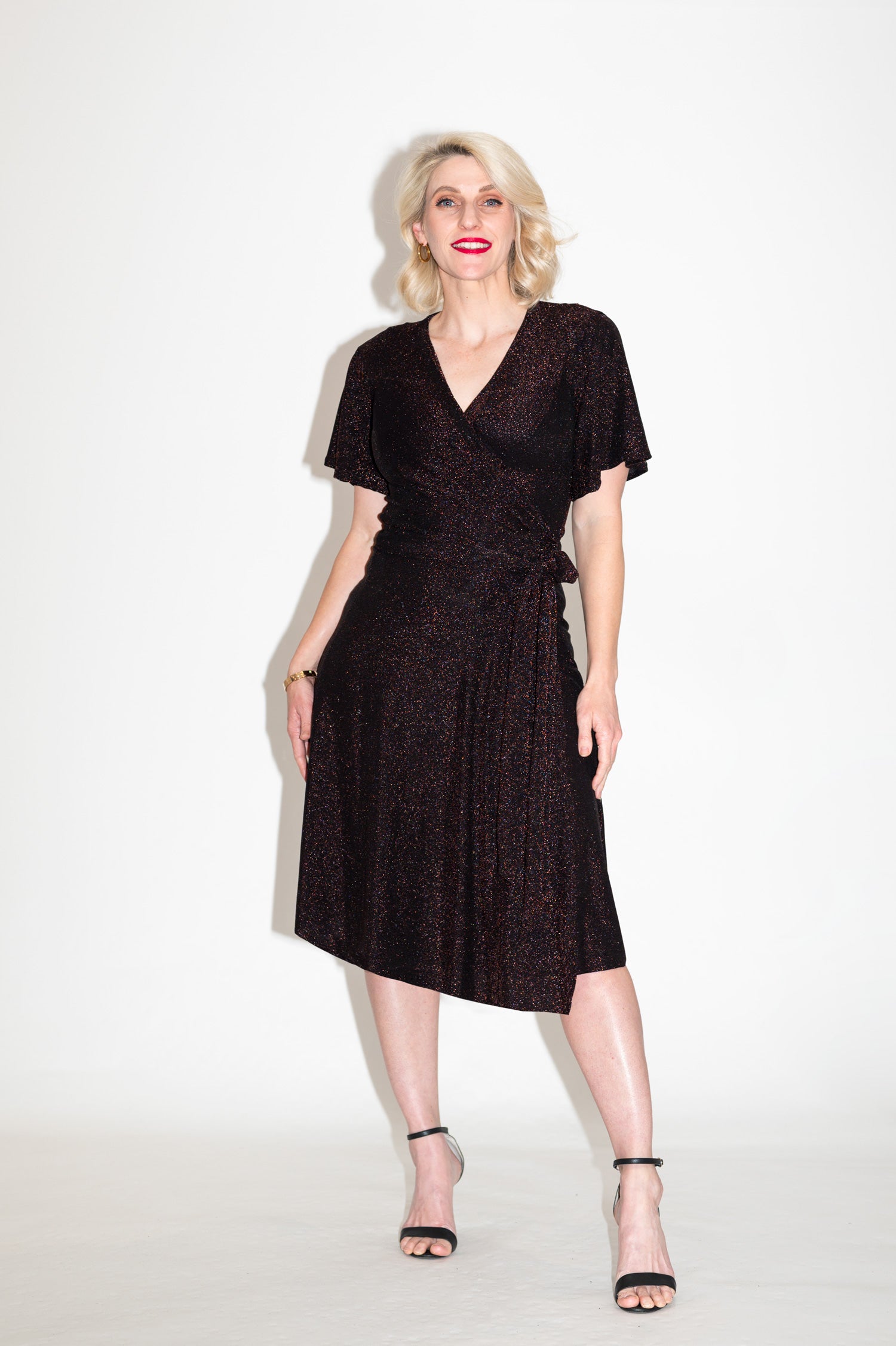 For the bright sparkle lovers. The Bonnie Wrap Dress in cocoa brown offers a warm, elegant twist on traditional evening wear. Its rich hue glows softly in the light while the shimmer-touch fabric adds luxe texture. A quietly powerful party dress that feels just as beautiful as it looks.