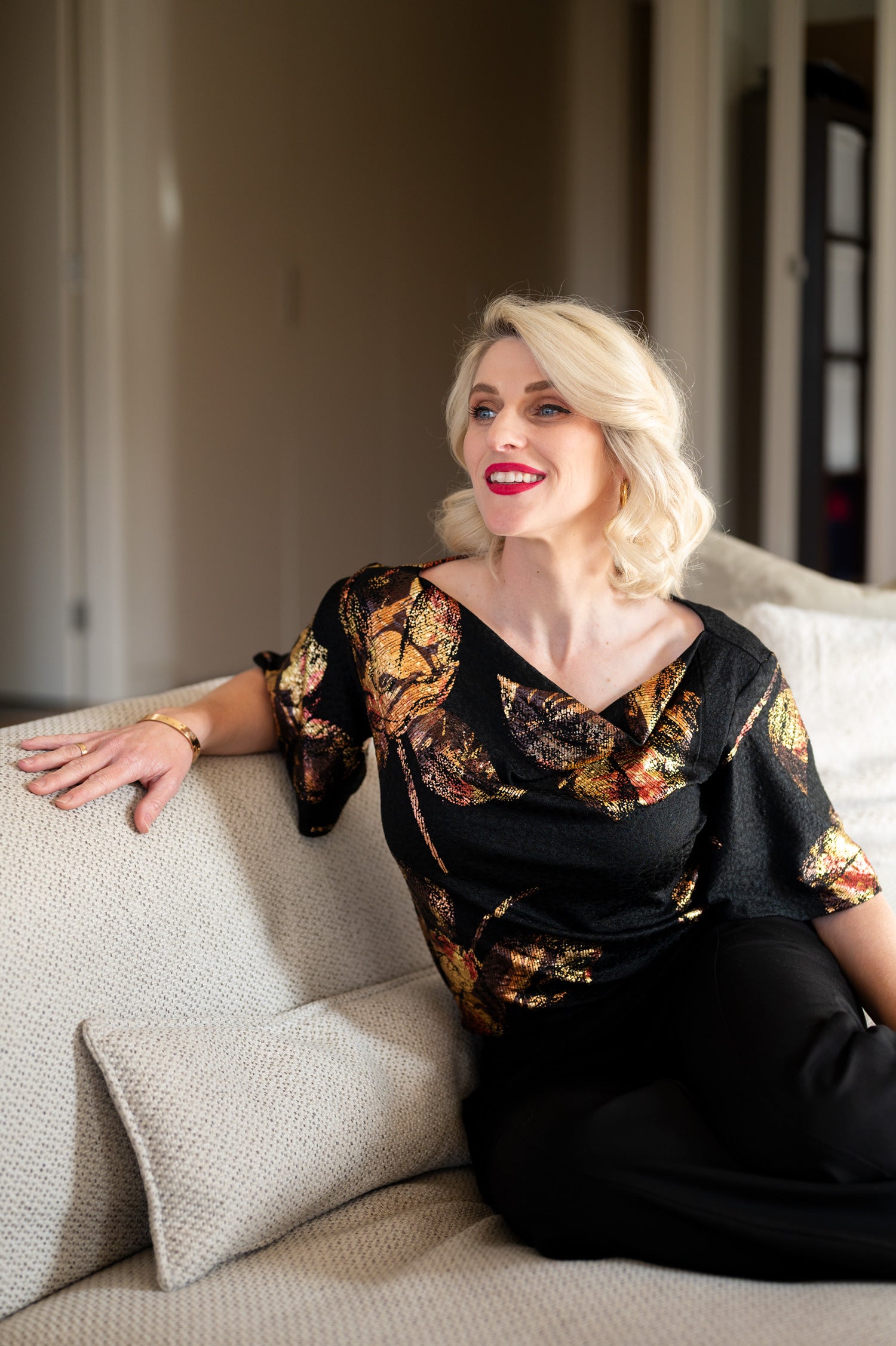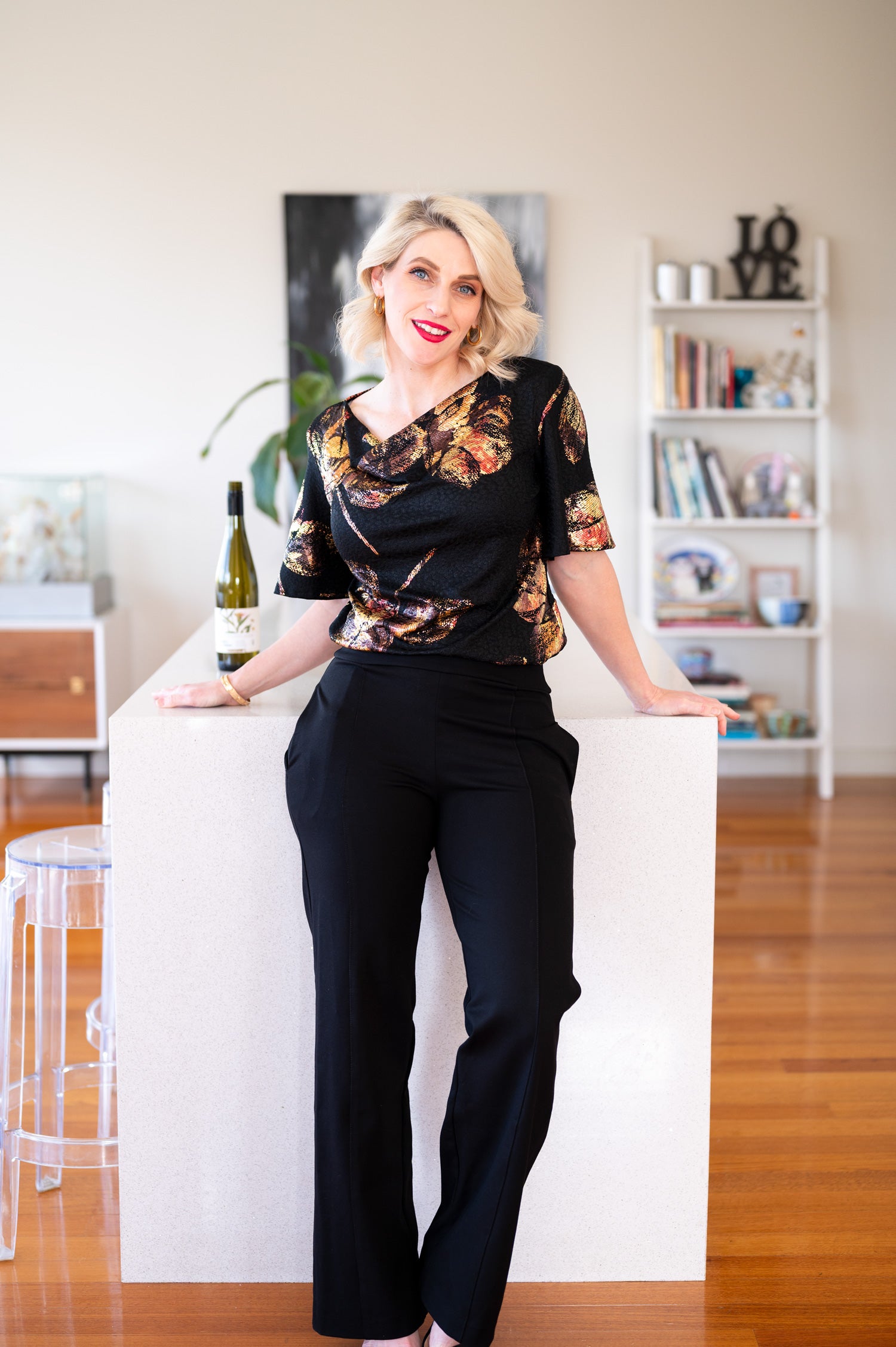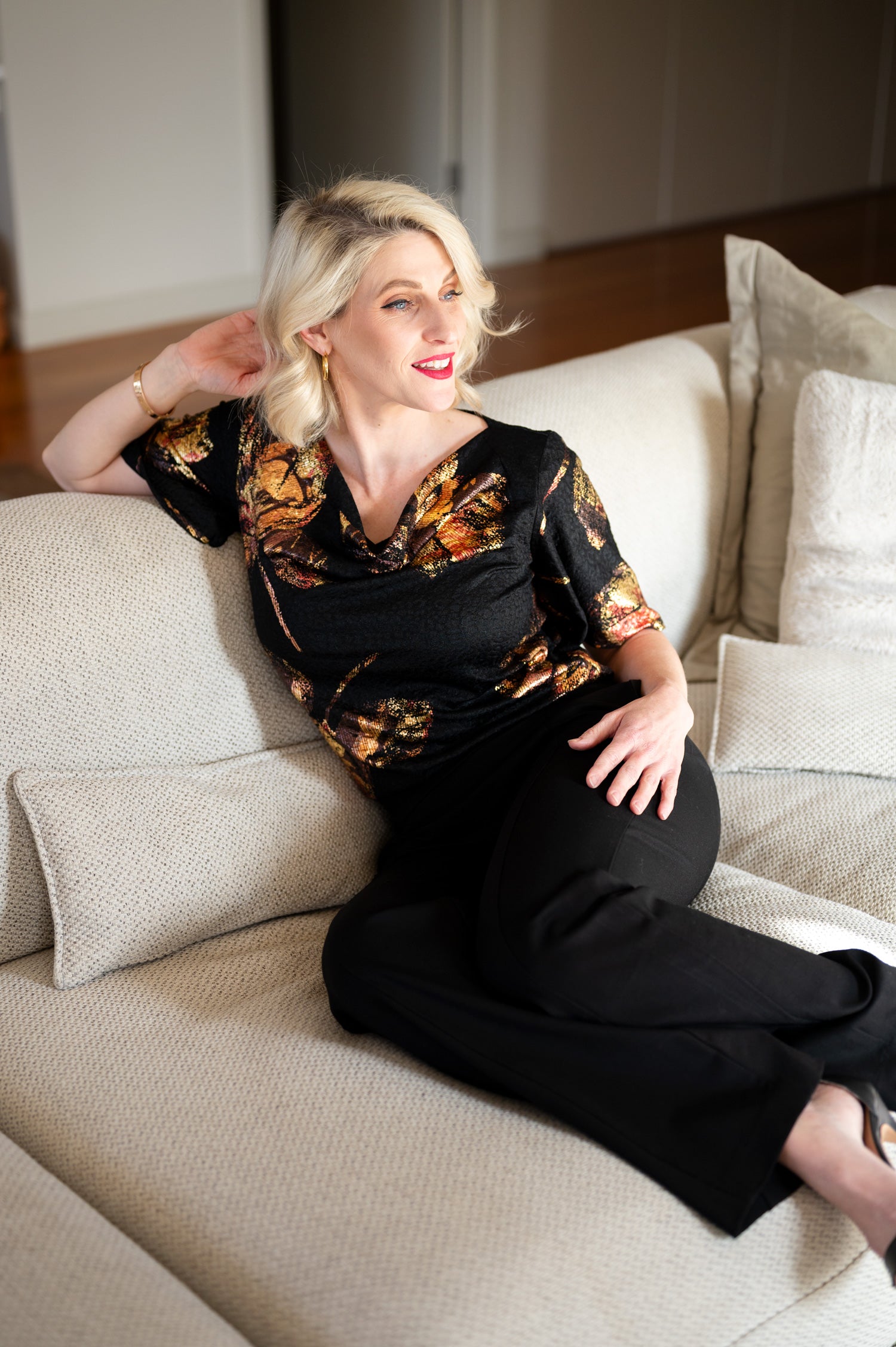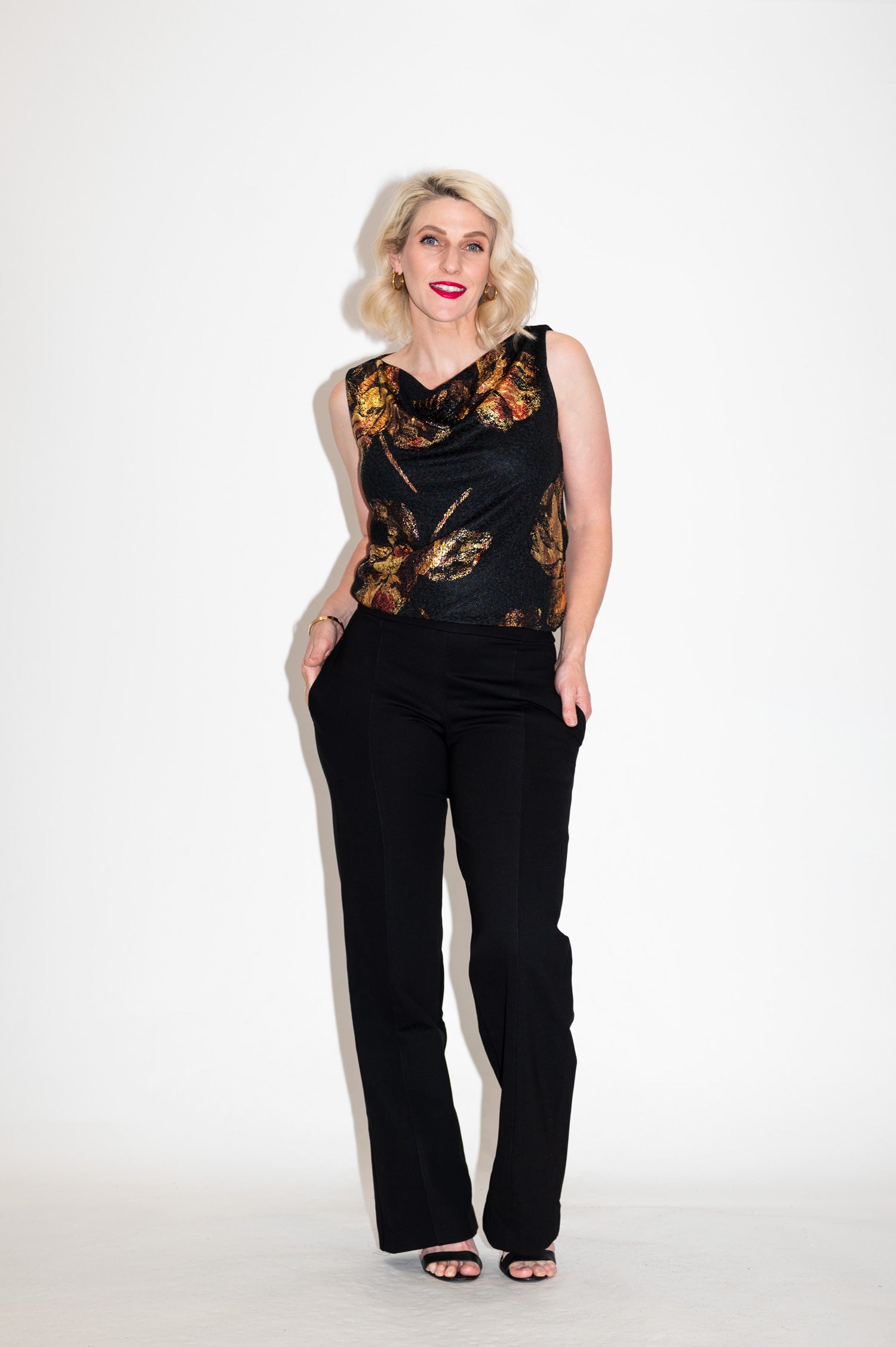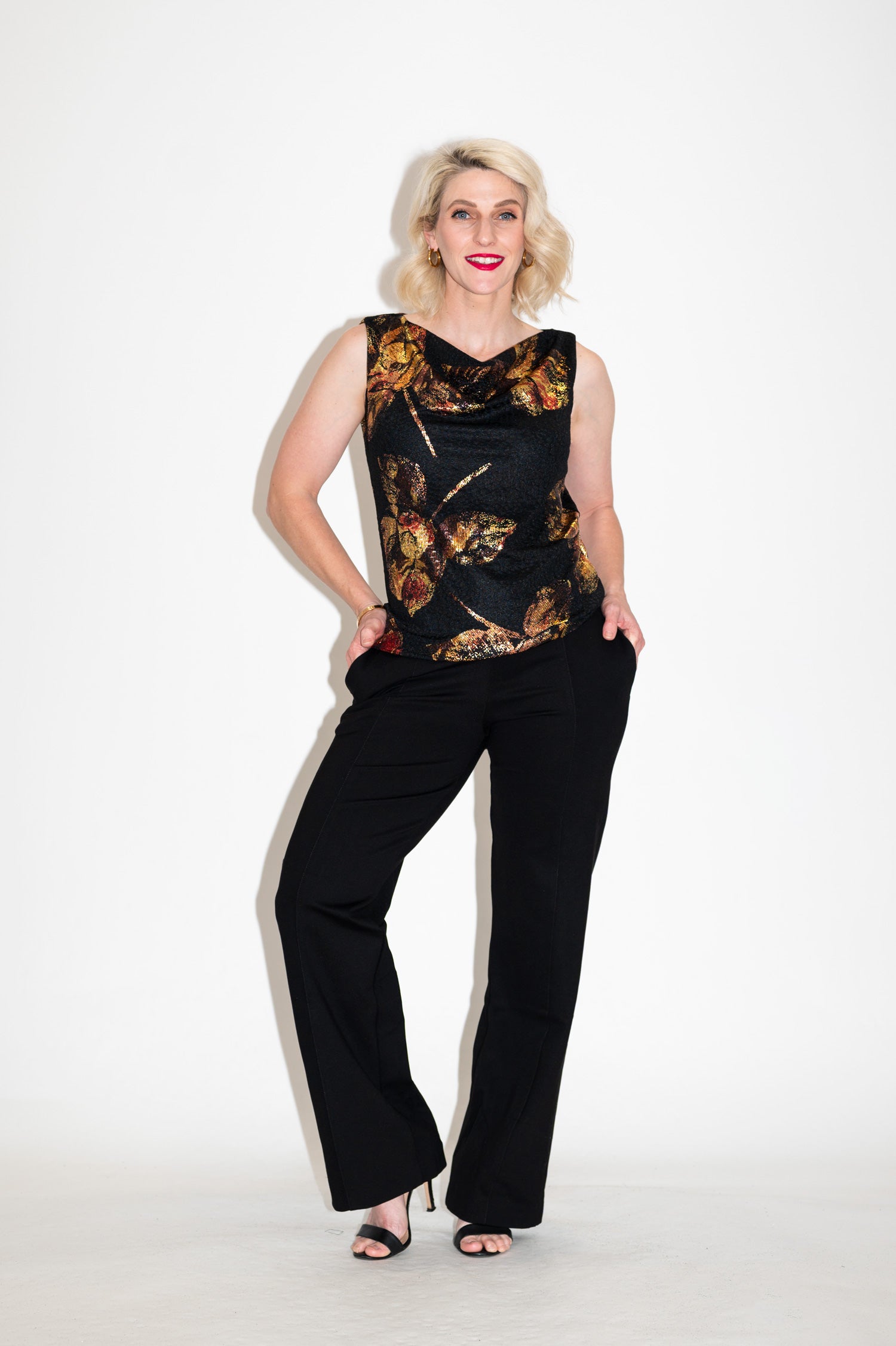 Elegantly draped and endlessly elegant, the Amber Cowl Top brings a touch of excitement to your favourite pants or skirts. With its flowing foil roses and black jacquard base, this top offers an artsy-glam finish to your look. Designed to feel as good as it looks, it moves effortlessly and shimmers in all kinds of light.