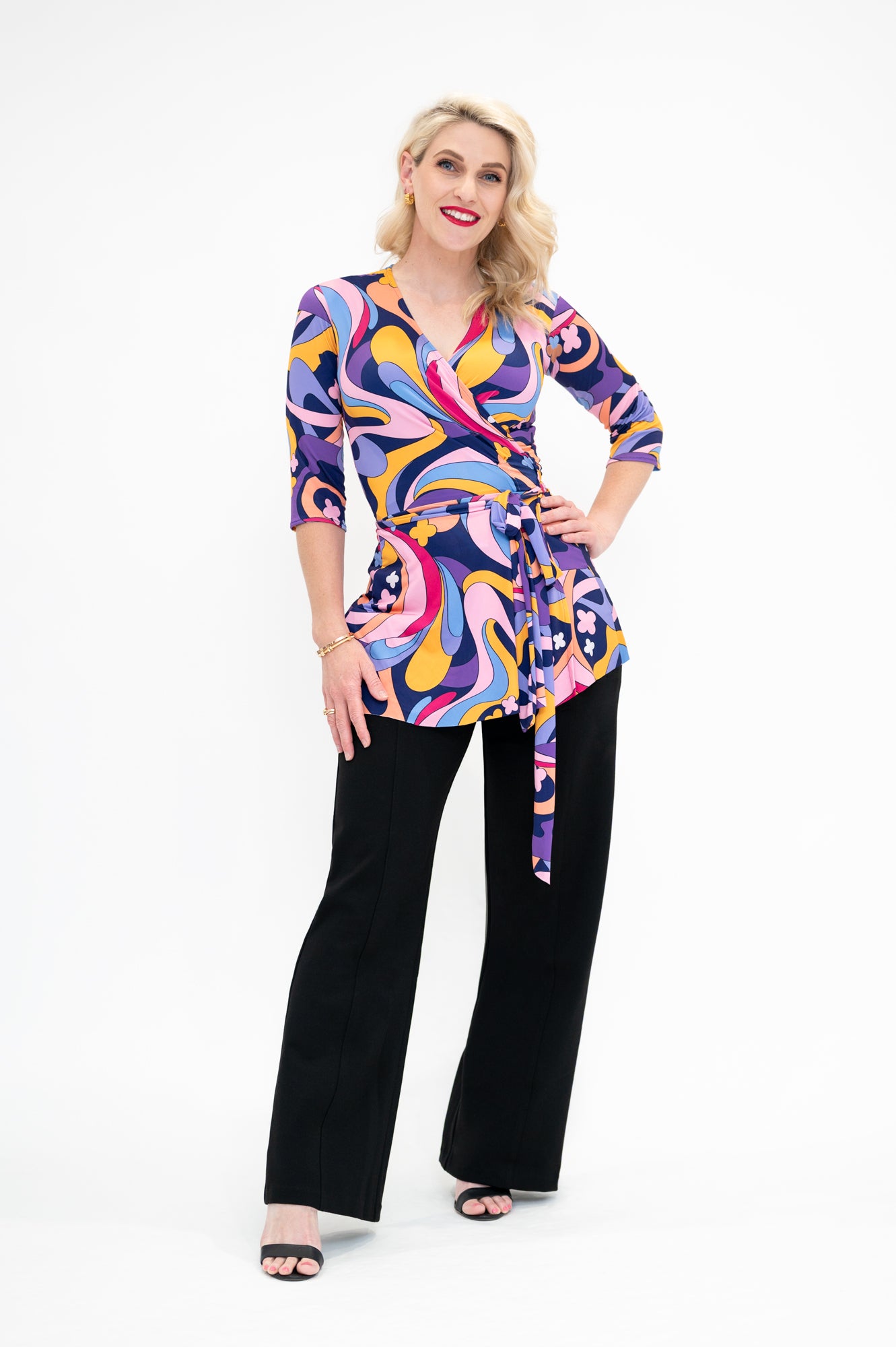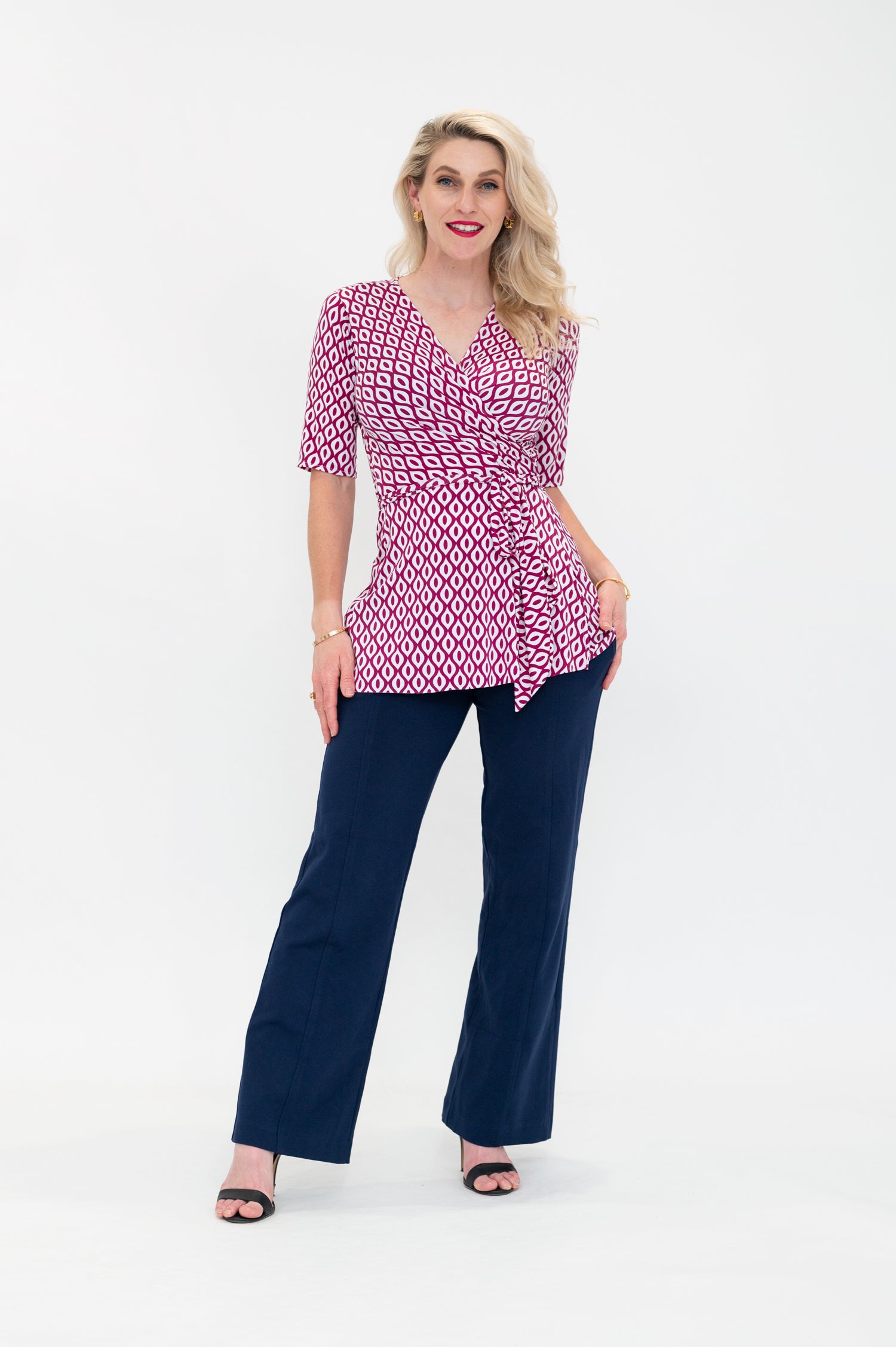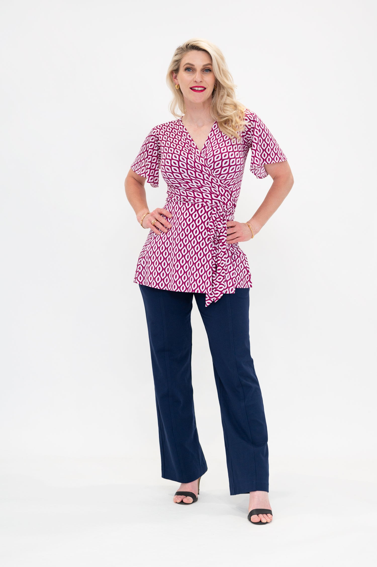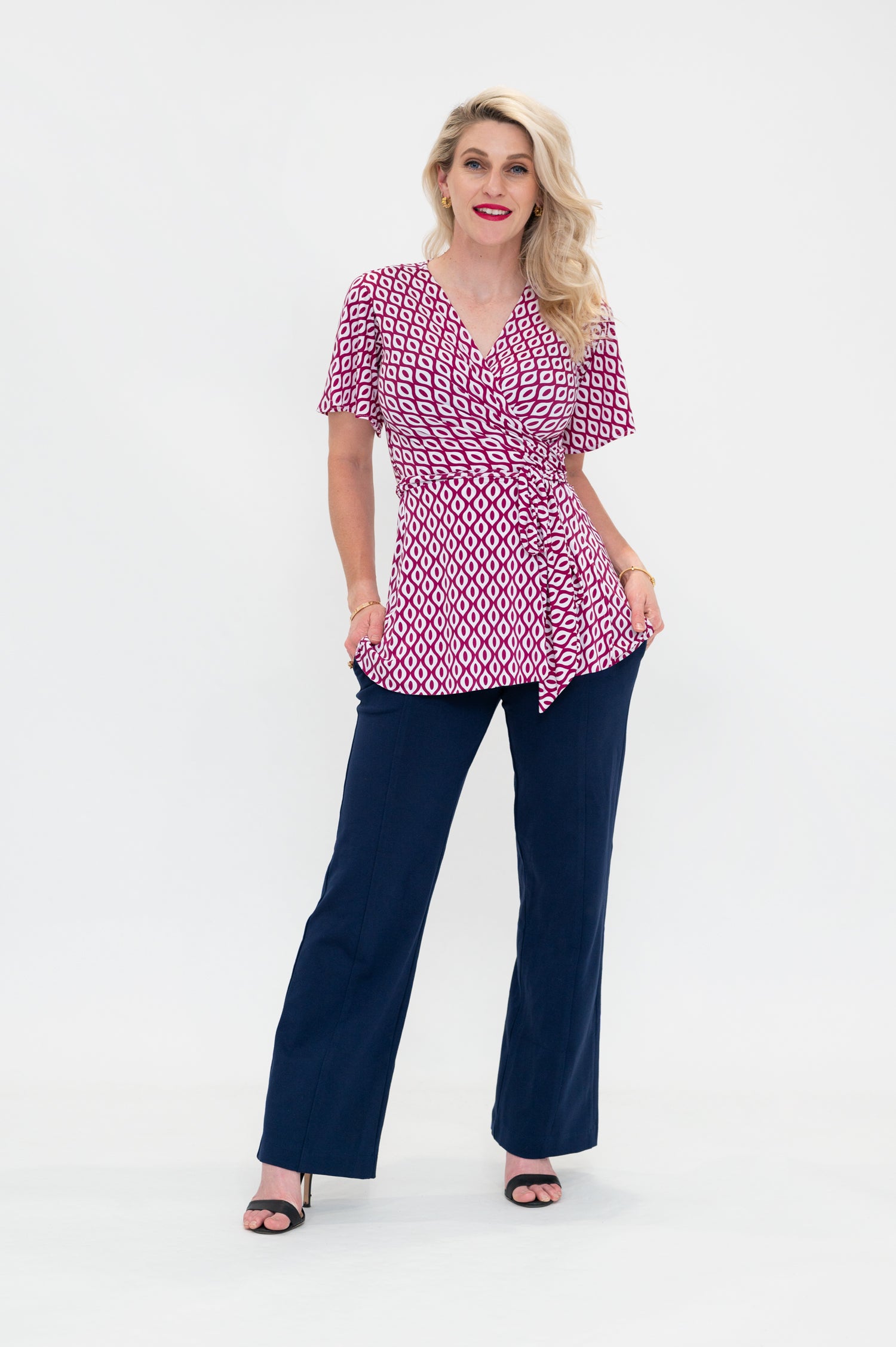 By Samantha Melbourne jersey wrap tops, made in Melbourne, offer a chic and timeless appeal. Designed to be plus-size and curve-friendly, it features our signature sleeve options (flutter sleeve, 3/4 sleeve, and sleeveless) for your perfect fit. Versatile and easy to wear, this top adds elegance to any look while ensuring comfort and style. The Wap top is the perfect top for a long torso, with its longer length, flattering peplum lines, tie waist, 3/4 sleeves and feminine v-neck.