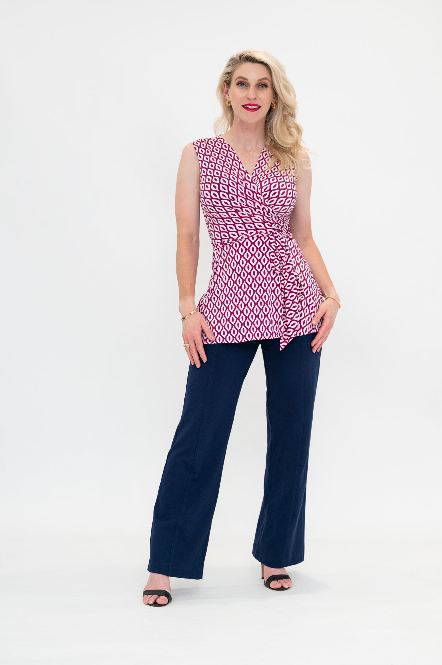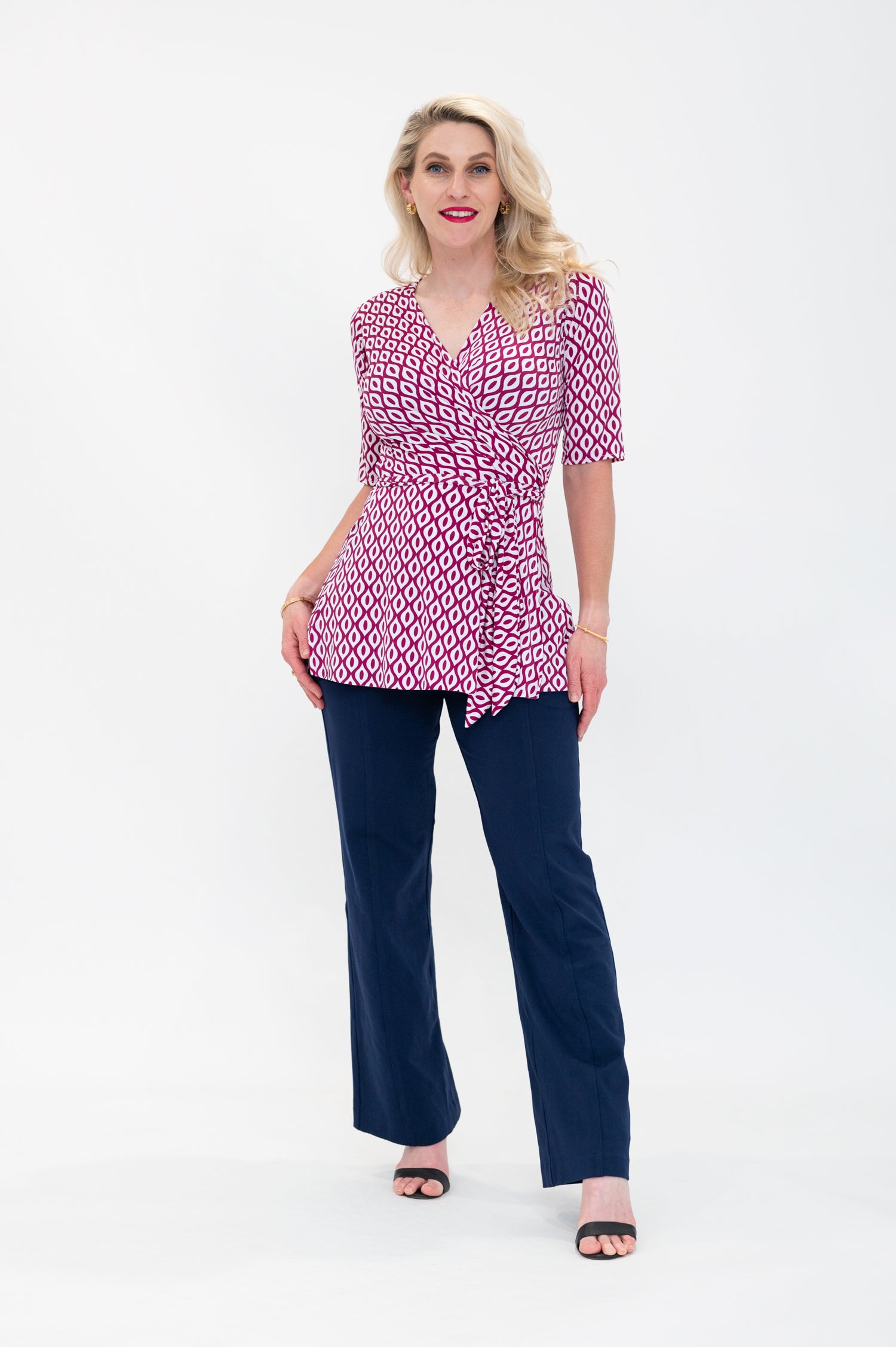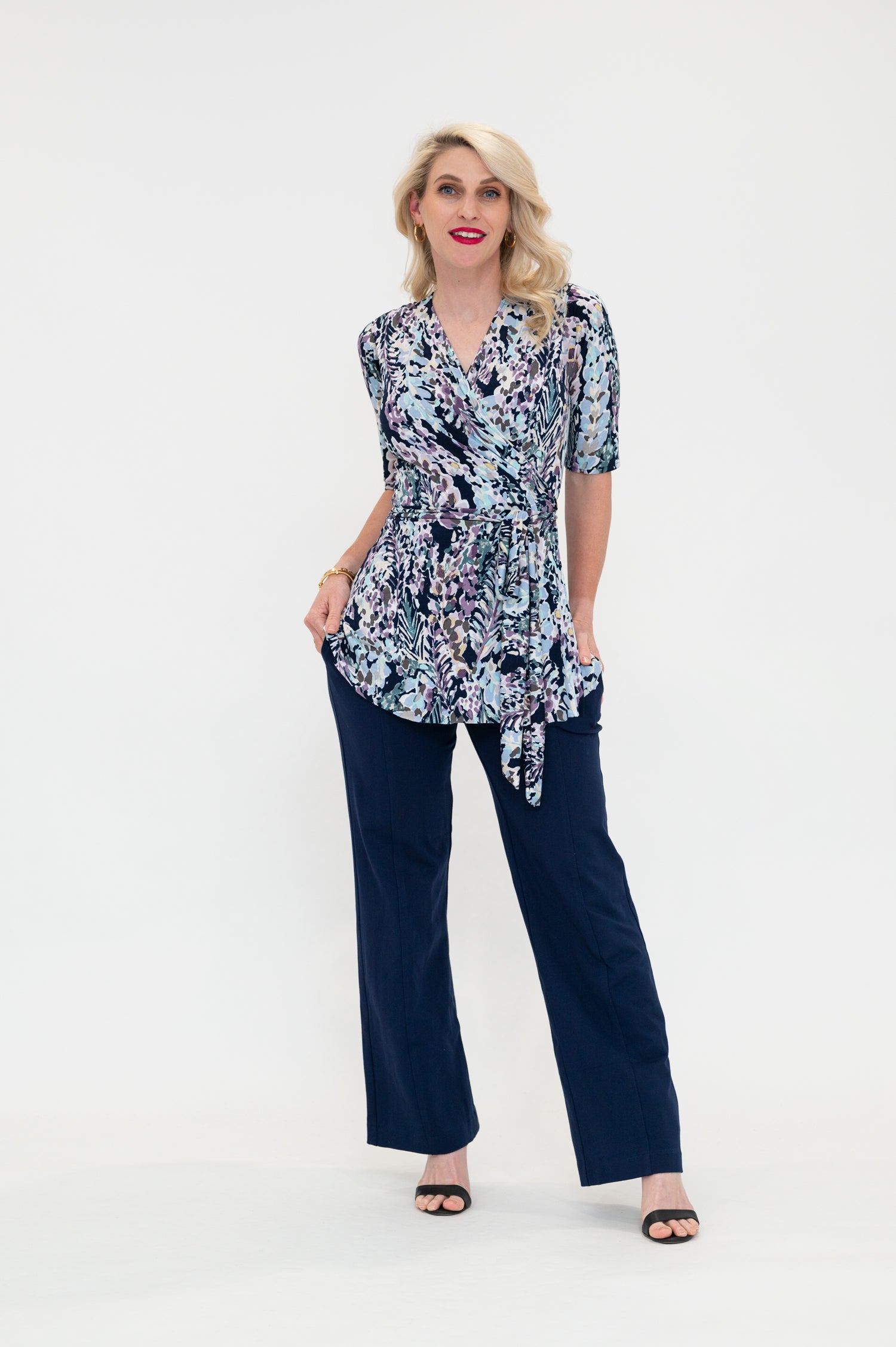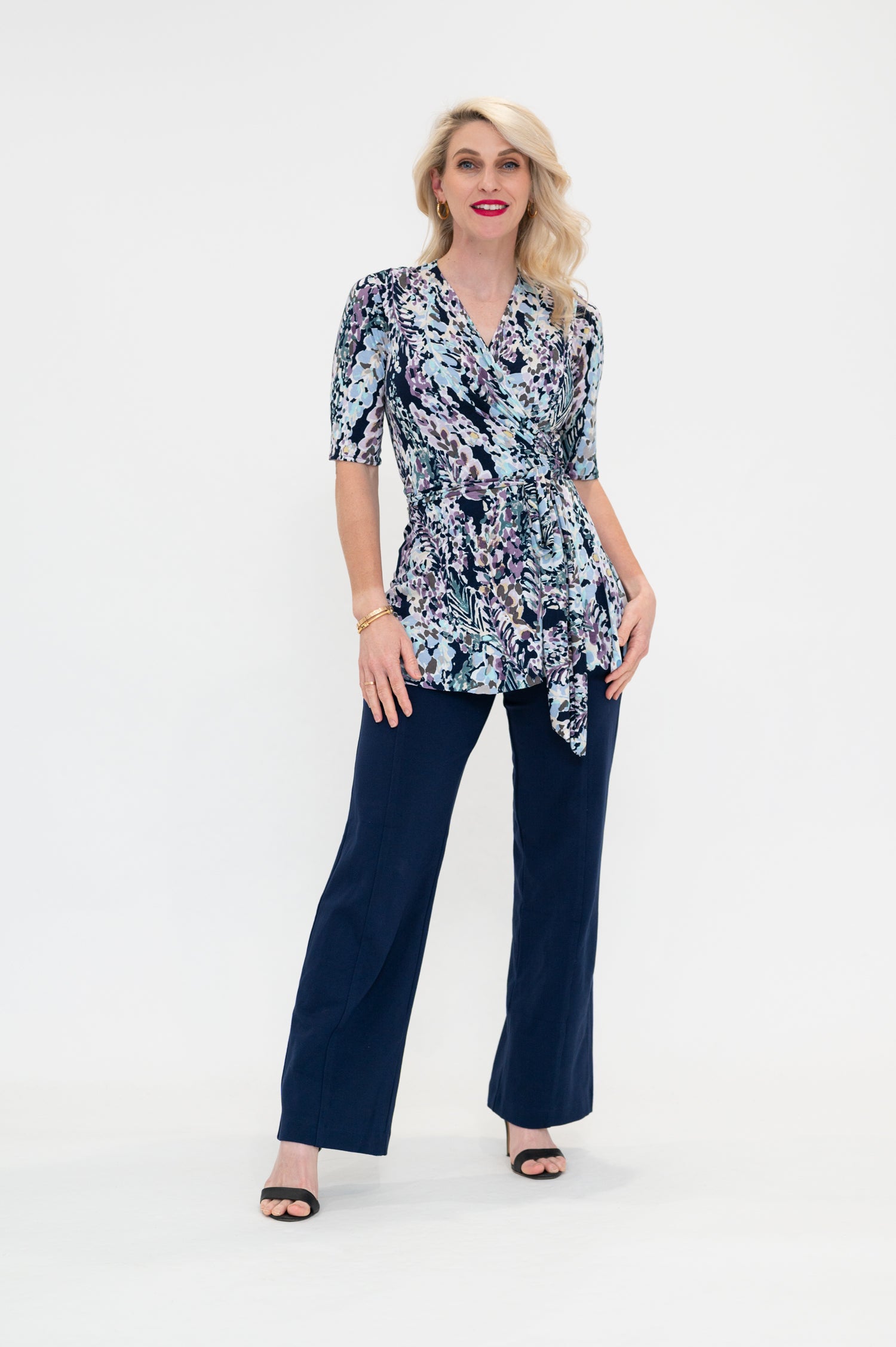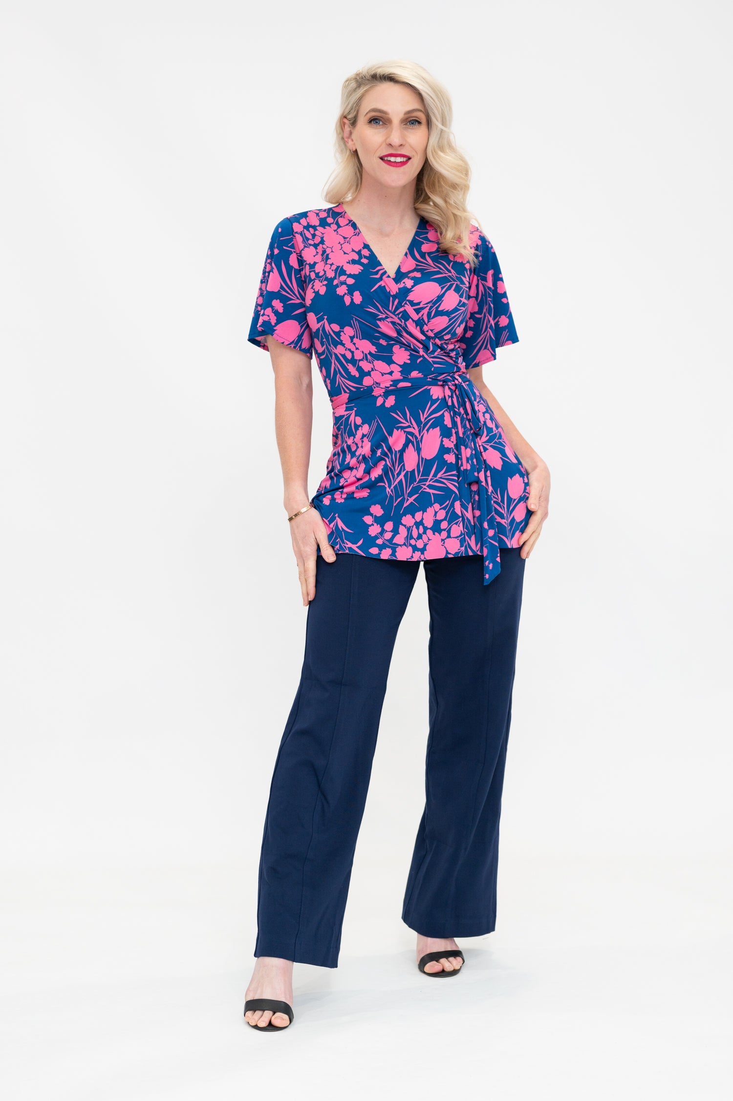 By Samantha Melbourne jersey wrap tops, made in Melbourne, offer a chic and timeless appeal. Designed to be plus-size and curve-friendly, it features our signature sleeve options (flutter sleeve, 3/4 sleeve, and sleeveless) for your perfect fit. Versatile and easy to wear, this top adds elegance to any look while ensuring comfort and style. The Wap top is the perfect top for a long torso, with its longer length, flattering peplum lines, tie waist, 3/4 sleeves and feminine v-neck.